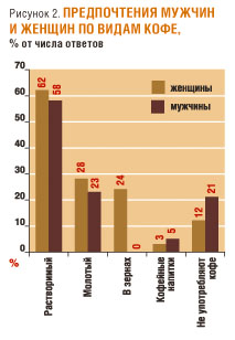 Кофе хотя и уступает чаю по популярности, все же пользуется высоким спросом - его потребителями являются 84% рязанцев. При этом традиционно наибольшей популярностью у респондентов пользуется растворимый кофе, которому отдают предпочтение 60% горожан. Наименее потребляемыми в Рязани являются кофейные напитки - их пьют только 2% опрошенных. Стоит отметить, что разница в потребительских предпочтениях мужчин и женщин по видам кофе не существенна (рис. 2).
