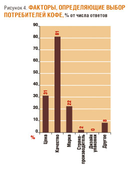 Решающим фактором при выборе кофе для большинства респондентов является качество - так ответили 81% опрошенных (рис. 4). Цена имеет первостепенное значение для 31% респондентов, а марка важна для 22% рязанцев. Интересно отметить, что на дизайн упаковки никто из участников опроса, по их словам, не обращает внимания, в то время как производители часто именно на нем делают акцент в своих рекламных кампаниях.