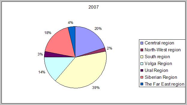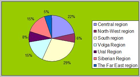 Согласно официальной статистики, в производстве минеральной воды продолжает лидировать Южный федеральный округ (ФО). Правда, по итогам первого полугодия 2008 года рост в этом регионе замедлился. Так, если в 2007 году предприятия округа покрывали 40% общероссийского производства с результатом 111 млн. дал и 15% ростом, то за два квартала 2008 года здесь было произведено только на 9% больше, чем за соответствующий период 2007 года, таким образом, доля региона в общем производстве в первом полугодии 2008 года снизилась до 30% и составила 57 млн. дал. Следующий за ним, Центральный федеральный округ в первом полугодии 2008 года добавил к своей доле в общем производства еще 2 п.п. - здесь за полгода уже произведено 43,5 млн. дал напитков, что на 26% больше, чем за соответствующий период 2007 года.