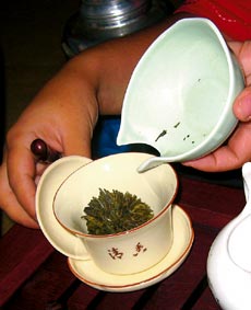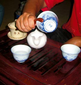 Фото 5. Спустя буквально несколько секунд настой из гайвани переливается в чахай - сосуд, напоминающий молочник и называющийся «море чая»: как и множество разных рек, попадая в море, становятся одинаковыми, чай из чахай
