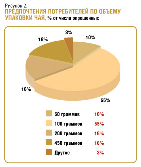 В ходе разовой покупки 77% опрошенных в независимости от вида фасовки приобретают одну упаковку, 19% - две, 4% - три и более. Причем 55% респондентов ответили, что они предпочитают упаковки чая весом 100 граммов (рис. 2).