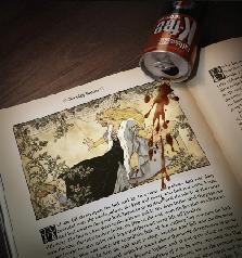 Немецкое агентство Jung von Matt/Fleet GmbH предупреждает, что с бодрящим напитком K-fee нужно обращаться аккуратно. Пролив его на книгу, можно разбудить Спящую Красавицу на картинке.
