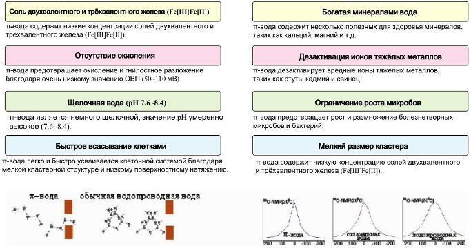 В состав Пи-воды входят железистые соли, которые очень эффективны в крайне малых количествах. При низком содержании железистая соль работает проводником в среде при передаче энергии и информации другим веществам и создает кластерную молекулярную структуру воды.