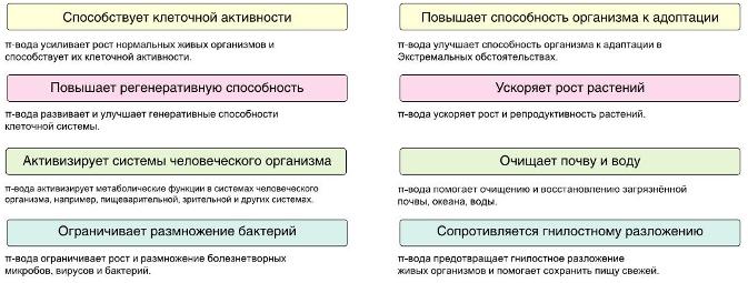 Что же касается больных, частично поврежденных клеток, то они содержат внутри себя достаточно высокий процент не структурированной воды и неспособны создать защитную оболочку, в результате чего, попадая в неблагоприятные условия, погибают гораздо быстрее. Целебное действие структурированной пи-воды заключается в замене клеточной воды с частично разрушенной структурой на структурированную кластерную воду, что позволяет увеличить время жизни и эффективность работы абсолютно всех клеток человека. Также эффект пи-воды проявляется в благотворном комплексном информационном воздействии на весь организм в целом, что позволяет организму самостоятельно гасить внутренние очаги патологий.