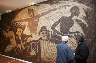 Албанский художник рассказал, что хотел бы, чтобы его последняя мозаика, профинансированная одной из крупнейших албанских кофейных компаний Lori Kafe, распространяла сообщение «Один мир, одна семья за чашкой кофе».