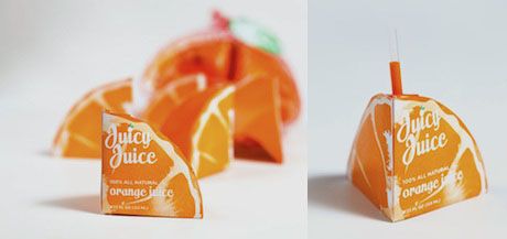 Упаковка внешне похожа на апельсин – округлая и оранжевая, и как апельсин, она распадается на дольки, которые в свою очередь и стали коробочками для сока.